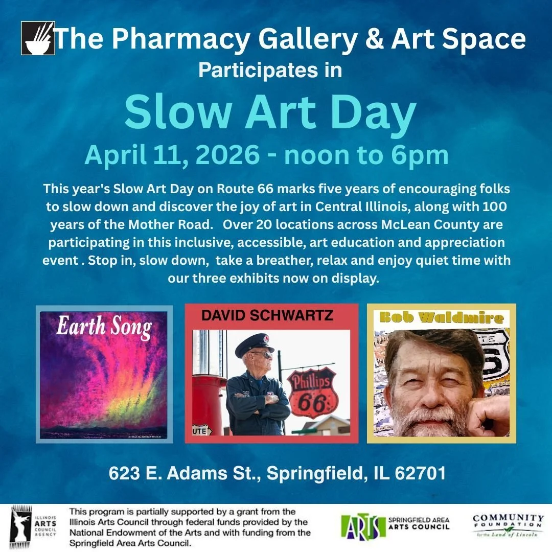 SLOW ART DAY- April 11, 2026 - noon to 6pm : Our first time participating in this International Slow Art Day. It encourages folks to slow down and discover the joy of art. Stop in, slow down, take a breather, relax and enjoy quiet time with our three exceptional exhibits on display. See Art Events for more information.